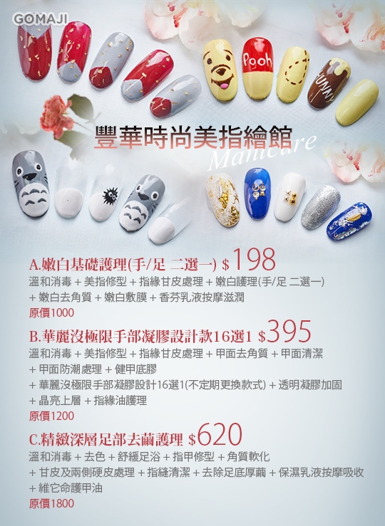 小資女孩的最愛!花少少的錢就能擁有專業的保養課程!快讓【豐華時尚美指繪館】滿足你愛美的心!華麗設計沒有極限,大方秀出美麗指尖吧!
